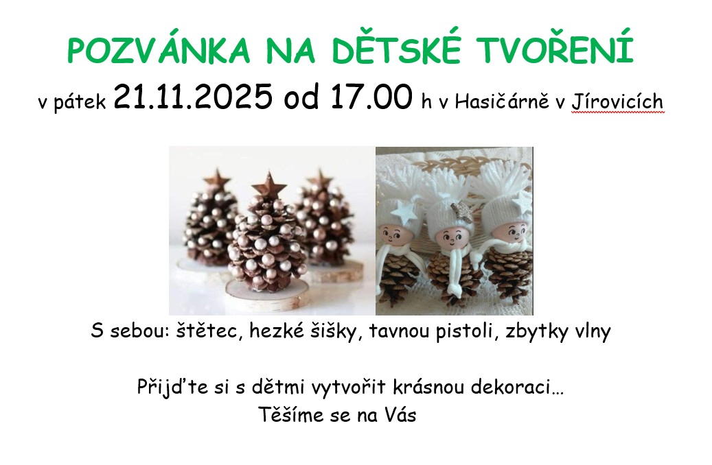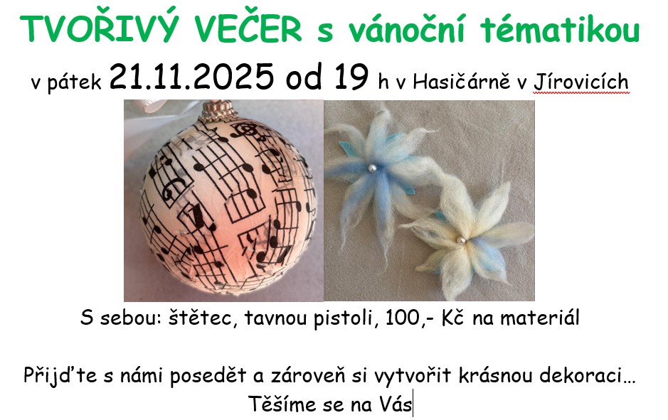 Z důvodu současné nepříznivé epidemiologické situace se přesouvá vánoční tvoření z hasičárny do vašich domovů. Materiál potřebný k vytvoření dekorací si můžete vyzvednout u pořadatelky Evy Strakové. V pátek od 17 do 20 hod. nebo v sobotu od 9 do 12 hod. Po domluvě i přivezu. Fotky s postupem nebo video bude v sobotu k večeru nebo v neděli dopoledne na webu Evy Strakové a na jejím FB. Děkujeme za pochopení.